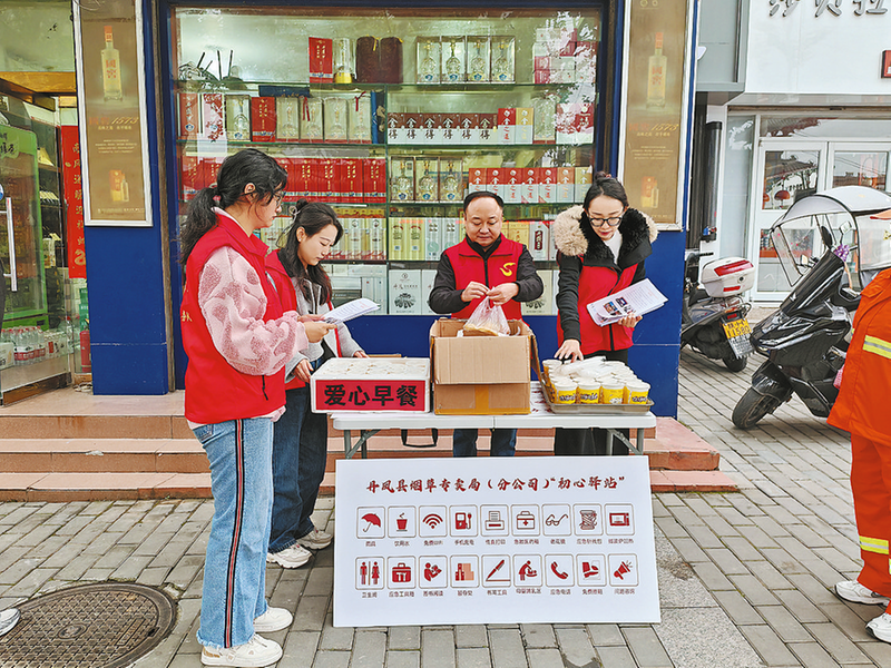 丹凤县烟草专卖局(分公司)“初心驿站”党群服务中心为环卫工提供免费爱心早餐。