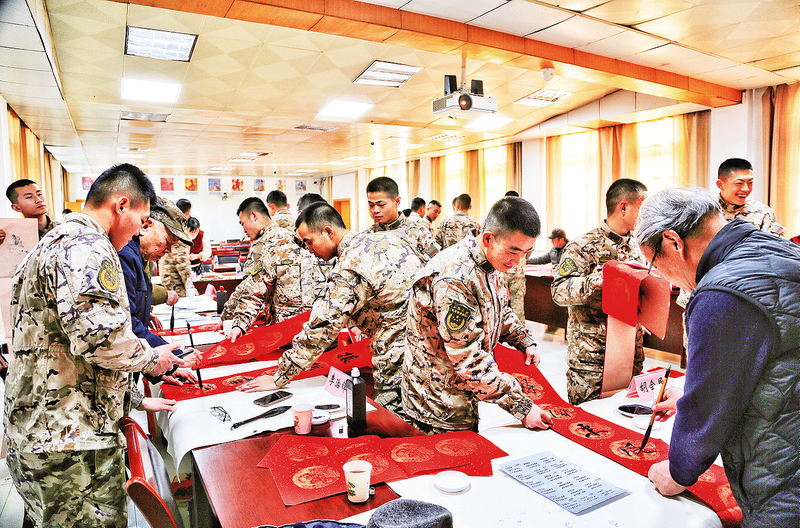 2月7日,商州区文联“强基工程”2026年清廉文化及义写春联“六进”活动走进商洛武警机动中队,10多名书画艺术家现场挥毫泼墨创作绘画、书法作品以及春联,丰富军营文化生活的同时为官兵们送上春节的祝福。 (本报记者 杨 鑫 摄)