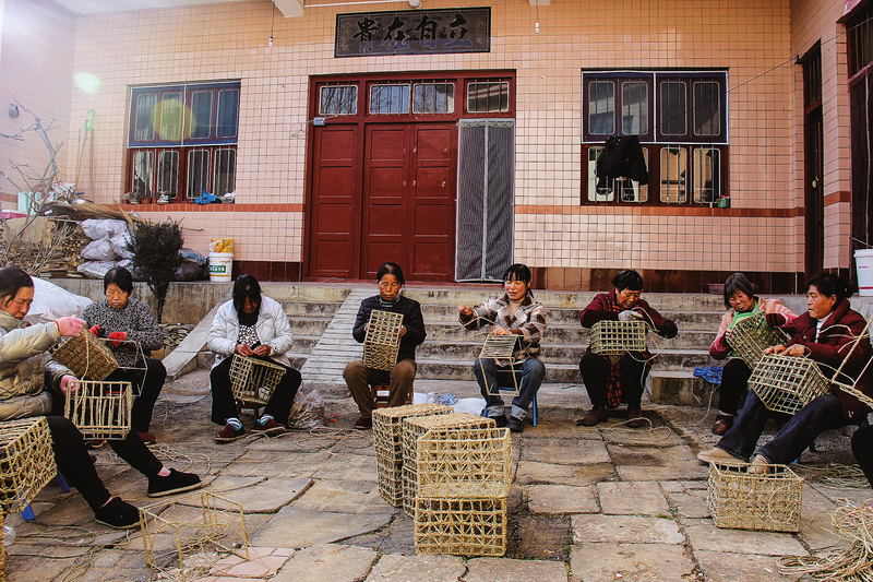 在四皓街道抚龙湾社区,几名村民围坐一起编织草编产品。洛南巧手工艺品有限公司将生产基地建在群众家门口,让 全县1万多名群众实现家门口就业。本报记者 马泽平 王江波