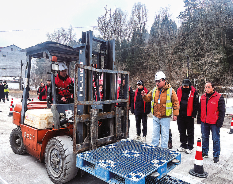 “注意控制车速,慢慢提升货叉,对准托盘的卡槽……”在洛南县四皓街道南沟社区叉车技能培训基地,教练正手把手指导学员操作叉车。