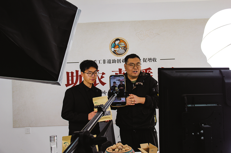 △在陕西原乡七间房农文旅发展有限公司的电商直播间里,“90后”创业青年余勇山(左)正和同事向网友介绍商洛特色农副产品。