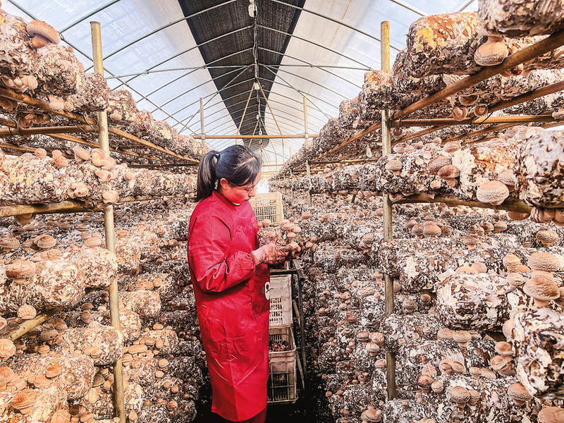 △洛南县五色田园现代菌业产业园里,工人正在采摘香菇。产业园的建成,让她们在家门口实现就业。