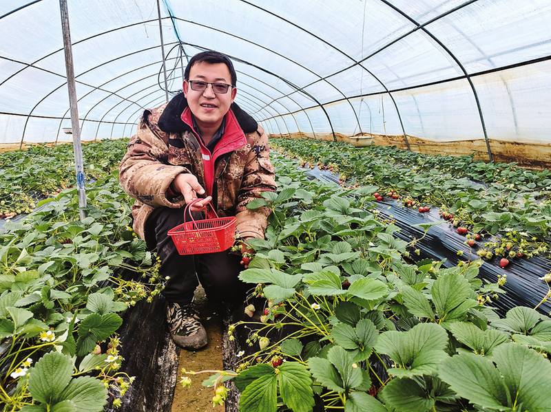 返乡创业大学生、大棚承包户柯雷在采摘草莓。农历腊月,年味渐浓。在商州区板桥镇下湾村的草莓大棚里,却是一派春日的景象。翠绿的藤蔓整齐地排列在地垄间,一颗颗鲜红的草莓晶莹剔透,犹如红宝石般挂在绿叶下,空气中弥漫着清甜的果香。