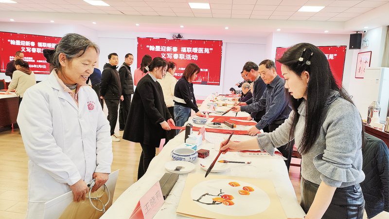2月5日,市妇幼保健院联合秦粤文化创新研究院、大秦岭文艺联合会商洛工委举办“翰墨迎新春 福联暖医苑”义写春联活动,书画家们现场为医护人员书写春联120多副、创作国画作品60多幅。(本报记者 贾书章 摄)