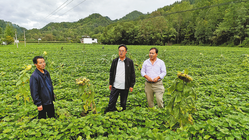 孙俊富(中)和镇村干部查看红薯长势。