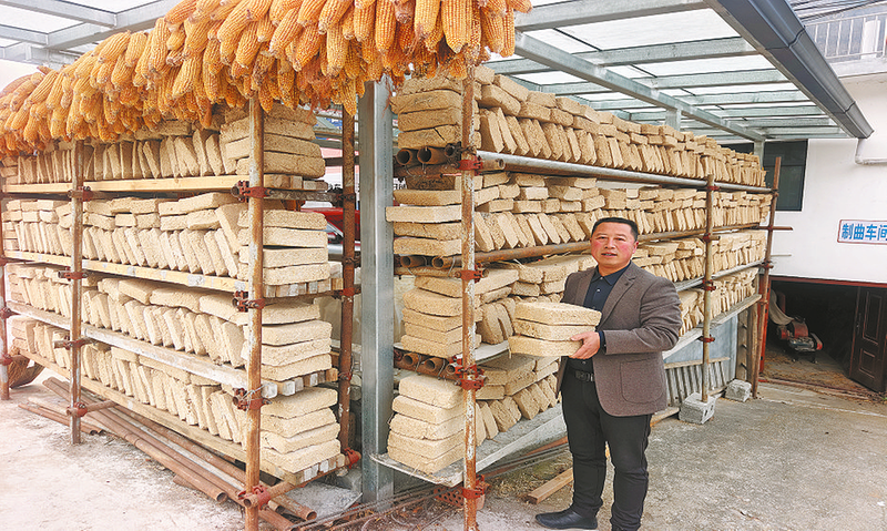 瑚世柱在农场里查看酒曲晾晒程度。