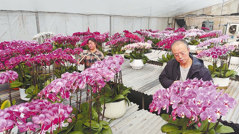 2月10日,在丹凤县商镇王塬村的宏丰园艺公司花棚内,花工在给蝴蝶兰浇水。该公司培育的蝴蝶兰正值花期,基本预售告罄,为市民马年春节增添喜庆气氛。