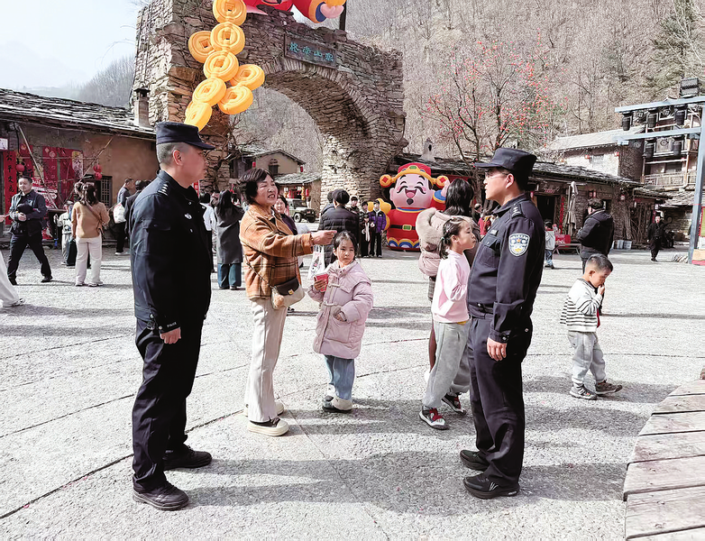 △2月21日,柞水县营盘派出所执勤民警在终南山寨景区安保巡逻。巡逻中,民警耐心解答游客对景区情况咨询,叮嘱游览景区的注意事项。 (本报通讯员 张 敏 摄)