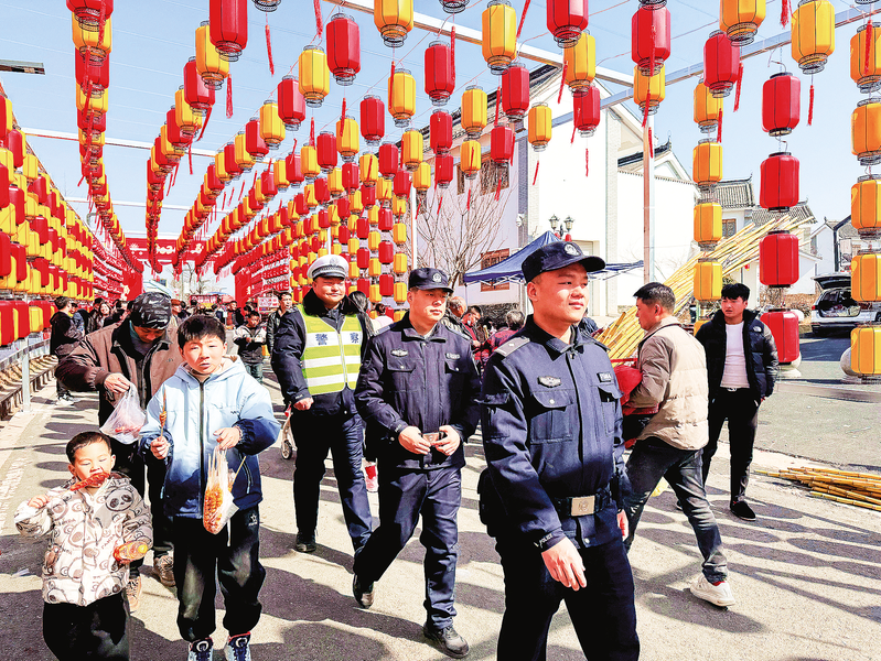 ▷2月17日(大年初一),洛南县四皓派出所安排精干警力在辖区重点景区音乐小镇开展执勤巡逻工作,全力确保景区良好秩序。图为执勤民警在游人如织的音乐小镇中巡逻值守。 (本报通讯员 白 媛 摄)