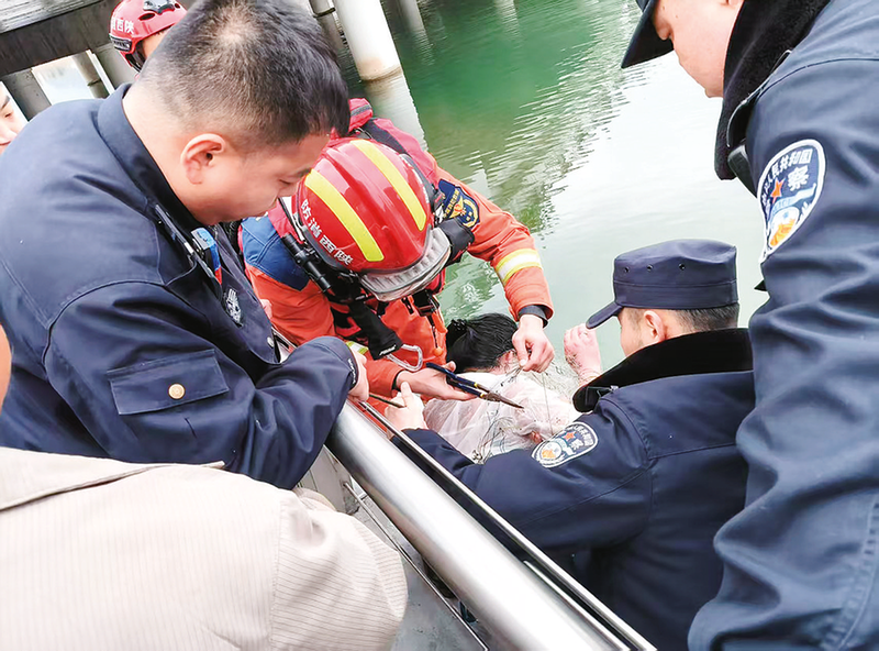 △2月16日(除夕)16时53分,商州区丹南派出所接警称两河口公园附近桥下有人落水。值班民警、辅警迅速出警并联系119、120,联合消防救援队将落水夫妻王某、赵某营救上岸,二人无生命危险,后由120送医。(本报通讯员 王宇欣 摄)