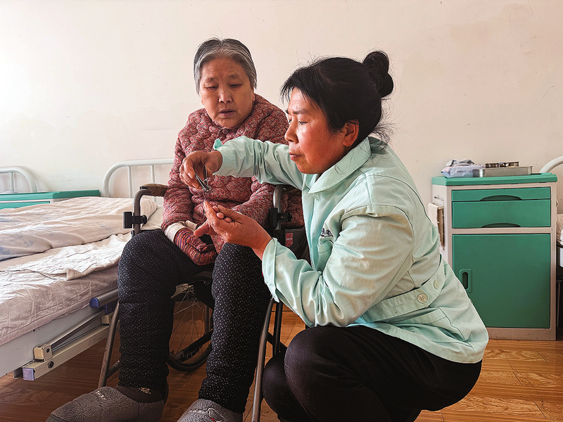 来不及多寒暄,罗福霞转身走向另一个房间。床上躺着一位生病的老人,只见她俯身熟练地为其翻身、按摩、擦洗、剪指甲、喂药,再利落地换上干净床单。整个过程行云流水,没有多余的话语,只有细致入微的动作。这是罗福霞在这里度过的第三个春节。