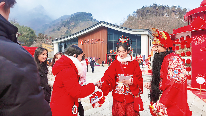2月21日,在秦岭天竺山景区内,“福禄寿喜财”NPC与游客亲切互动,派发新春祝福。