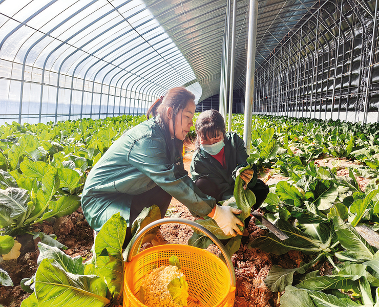 在洛南县生态农业放心菜示范园内,务工群众在采收菜花。2月24日,位于洛南县城关街道陶岭社区的陕西洛水情源农业科技有限公司放心菜种植基地里,一排排日光温室大棚鳞次栉比。棚内,一串串西红柿宛如红宝石般垂挂枝头,有着20多年蔬菜种植经验的“土专家”、公司负责人张平为新培育的牛奶西红柿进行叶面“施肥”。