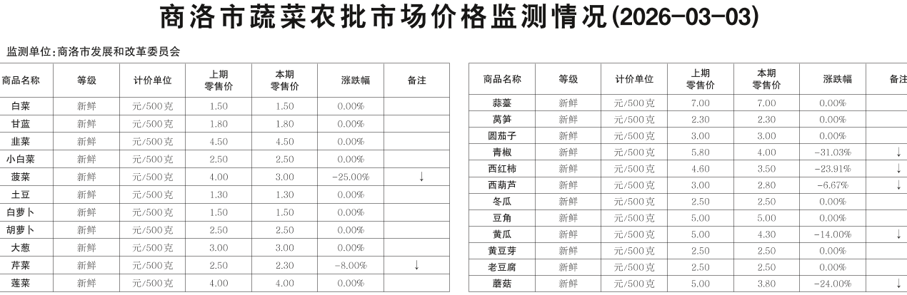 商洛市蔬菜农批市场价格监测情况(2026-03-03)