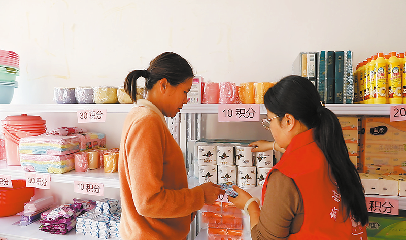△3月2日,庙沟镇双喜村群众在“道德超市”用积分兑换生活用品。