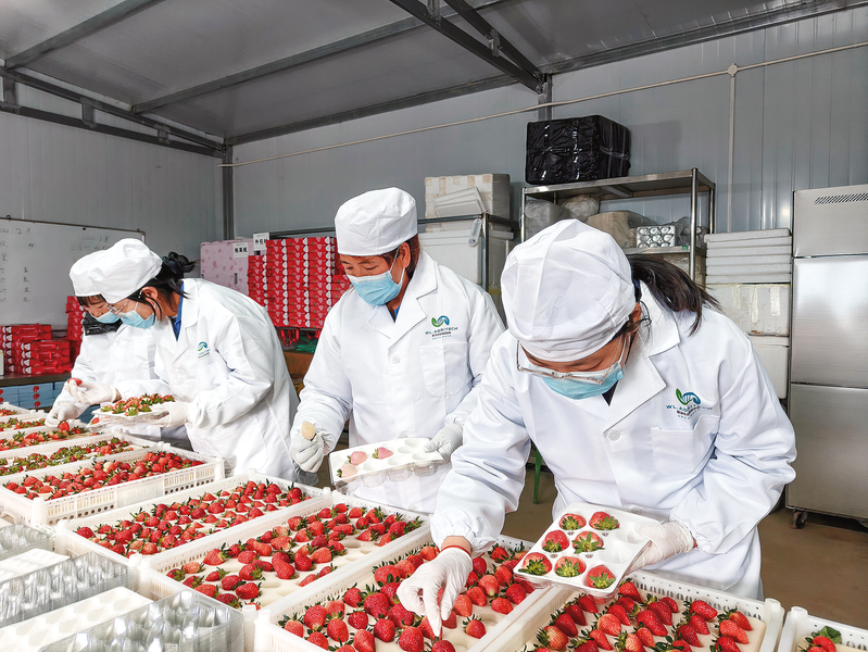 洛南县蔚涞农光农业科技有限公司从新加坡引进夏季耐高温甜草莓新品种,目前已建成全国首个全年不间断草莓生产基地、全国首个夏草莓大田示范基地。今年将扩建300亩夏季耐高温甜草莓的种植及育苗中心,可带动保安镇当地200多人就近就业。图为3月5日,工作人员正在分装新鲜草莓。 (本报通讯员 毕波波 摄)