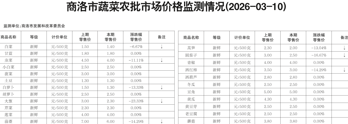 商洛市蔬菜农批市场价格监测情况(2026-03-10)