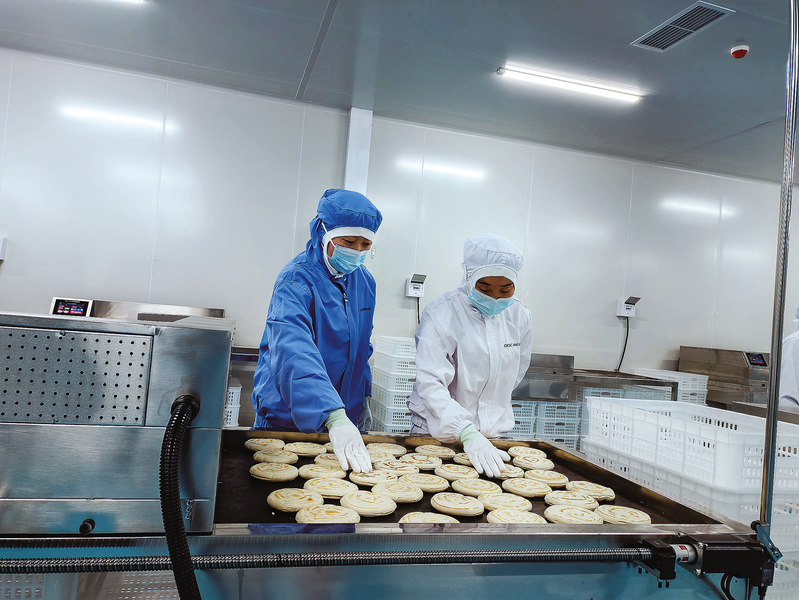 3月5日,工人在商洛秦吼食品有限公司车间分拣包装白吉饼。该公司位于商州区荆河生态工业园,于2025年12月20日生产,主要产品有泡馍、肉制品、饼、面食、汤底、浇头、调味料等七大类100多种。产品通过线上线下销往西安、上海、广州、深圳等地,有的还出口到马来西亚。 (本报记者 王孝竹 摄)