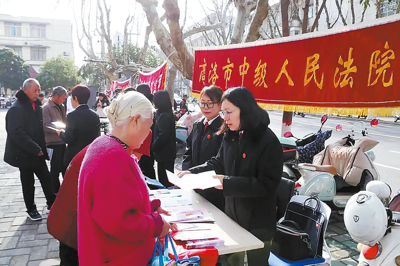 近日,商洛市中级人民法院女法官干警走上街头,开展“三八”妇女节暨“女法官国际日”妇女维权法治宣传活动,向群众详细讲解妇女权益保护、未成年人保护、预防投资诈骗等法律知识。针对群众提出的各类法律疑问,耐心倾听、细致解答,引导群众学会用法律武器维护自身合法权益。 (本报通讯员 闫莉霞 摄)
