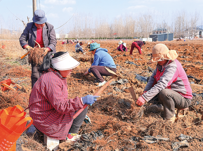 村民抢抓晴好天气采挖丹参。