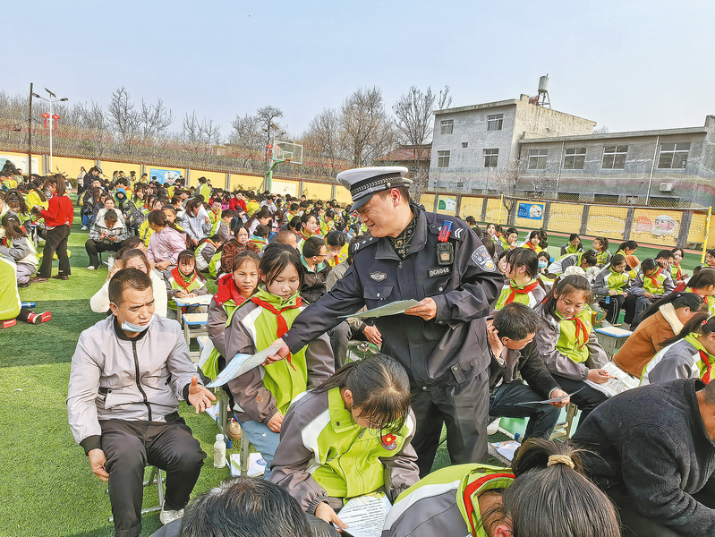 3月12日,丹凤县公安局商镇派出所民警走进辖区老君小学,开展“知危险、会避险”交通安全主题宣传活动,为全校师生送上一堂生动鲜活的“开学安全课”。 (本报记者 雷 琳 摄)