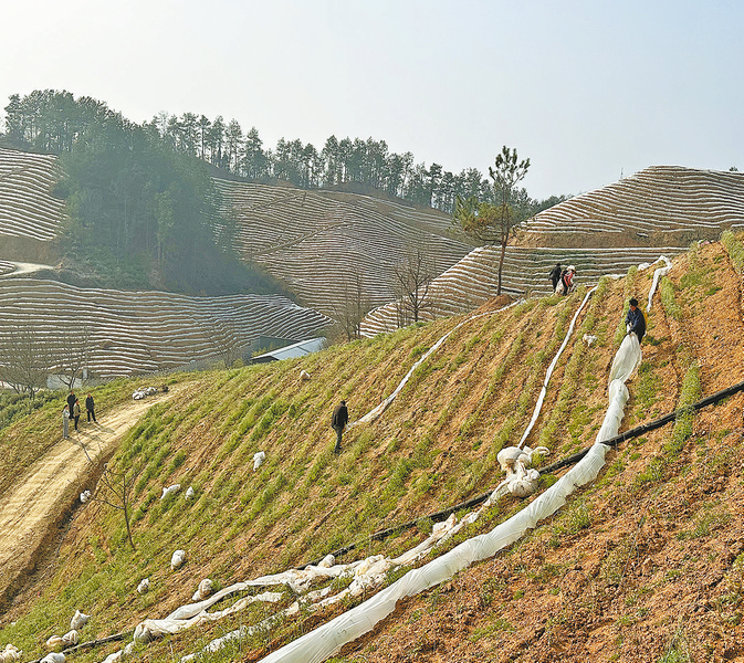 3月11日,在商南县富水镇王家楼村,务工群众正在富水·山居茶旅文化示范园给茶树苗脱膜。据该项目负责人潘世斌介绍,园区自去年动工以来,已推动茶苗引入、给水灌溉、基础道路、排水设施等项目建设,现种植白茶和黄茶400亩,带动王家楼村村民在此务工增收。 (本报记者 胡 蝶 摄)