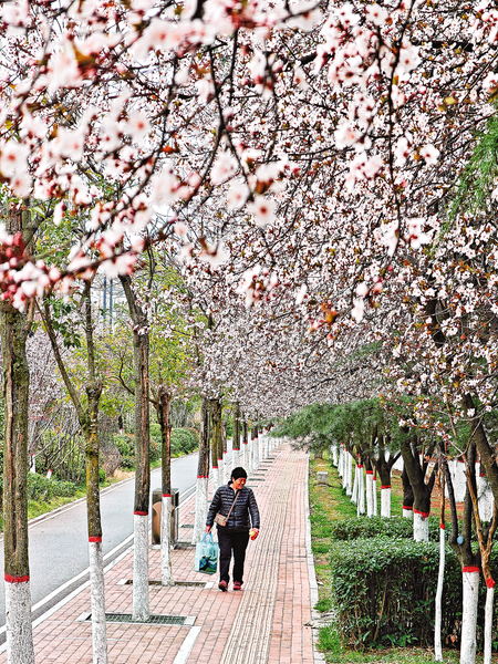 商州区江滨公园人行道旁,红叶李竞相绽放、香气袭人,市民穿    行其间,如入画境。