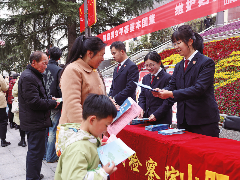 近日,山阳县人民检察院会同该县公安局、司法局、妇联等单位,开展“法治护航她权益 巾帼同心向未来”主题普法宣传活动。检察干警通过设置咨询台、发放宣传资料、讲解典型案例等形式,向群众普及妇女权益保障法、未成年人保护法、反家庭暴力法的法律知识,并耐心解答群众在生活中遇到的法律问题。 (本报通讯员 杨 钊 摄)