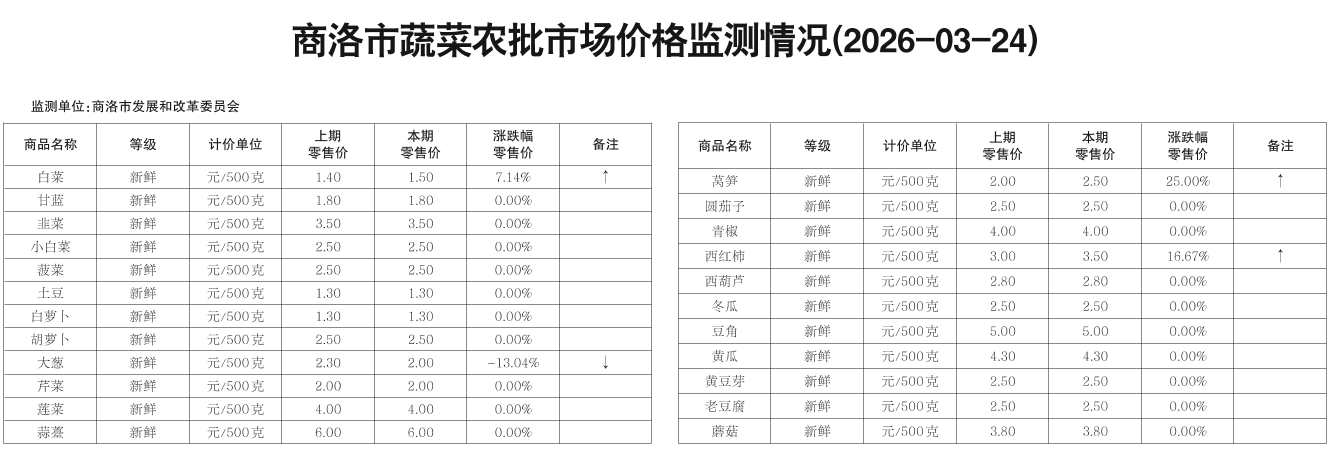 商洛市蔬菜农批市场价格监测情况(2026-03-24)