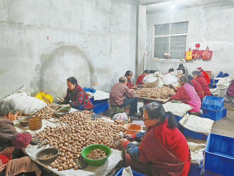 三月二十八日,务工群众在丹凤县龙驹寨街道凤麓社区的一处核桃加工作坊内加工核桃仁。据悉,该加工作坊由本地客商李新华创办,带动周边二十多名群众就近务工,每人每天收入五十元至六十元不等。(本报通讯员田东 摄)